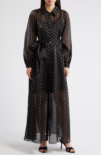 Shirtdress style comes for the party circuit in this dot-dappled option cut from a sheer fabric in a full-length silhouette.