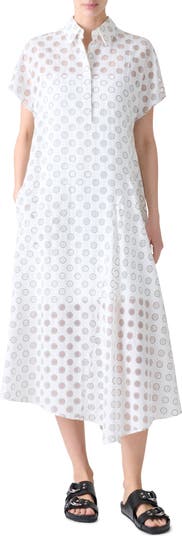 Eyelet-look organza polka dots are a new, mod take on the brand's signature dot motif as the allover patterning for this shirtdress shaped with short dolman sleeves and an asymmetric hem.