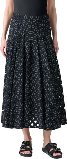 Eyelet-look organza polka dots are a new, mod take on the brand's signature dot motif as the allover patterning for this midi skirt shaped by pintucks at the yoke that release into soft, silhouette-flaring pleats.