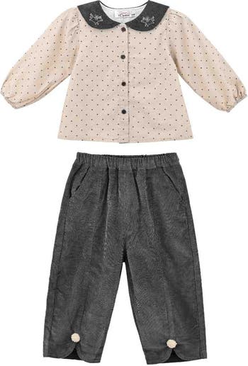A sweet and stylish set featuring a puff-sleeved blouse with embroidered collar and relaxed-fit pleated pants. The playful polka dots and tailored details make it perfect for everyday charm or dressed-up outings. Embroidered contrast collar and puff sleeves add vintage flair to the blouse. Pleated pants with cuff buttons offer comfort and a polished finish.
