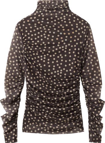 Pretty retro polka dots make a bold statement on this stretchy mesh turtleneck top that's an instant fave.