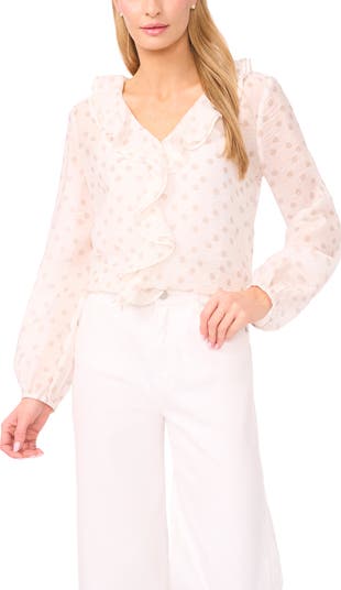 Faded polka dots and delicate ruffle trim set a romantic tone on this semi-sheer top framed by long blouson sleeves.