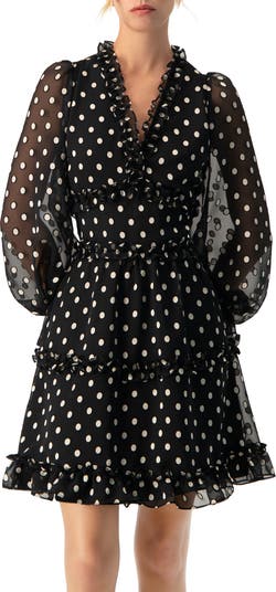 Polka dot short dress featuring ruffled details, wide long sleeves and a V-neckline.
