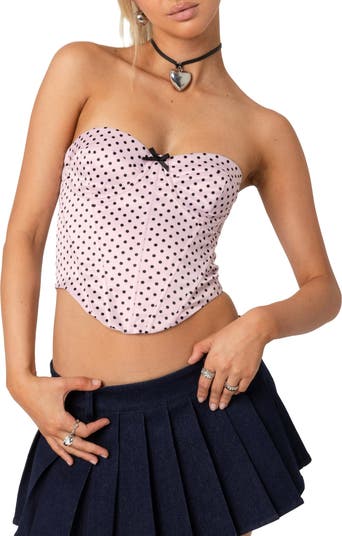 Dainty dots bring sweet energy to this bow-adorned corset top with a lace-up detail in the back.