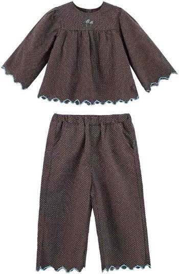 A charming two-piece outfit designed for playful elegance. This coordinated set features a long-sleeved top with flared sleeves and matching pants, both adorned with delicate scalloped hems trimmed in light blue. The subtle polka dot print and floral embroidery add a sweet, boutique-inspired touch. Gathered yoke top with flared sleeves and embroidered chest detail. Elastic-waist pants with side pockets and matching scalloped trim.
