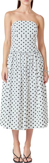 Channel playful retro style in this strapless A-line dress covered in classic polka dots.