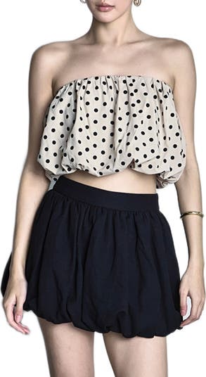 Preppy polka dots make their mark on this strapless bubble top in a perfectly cropped length.