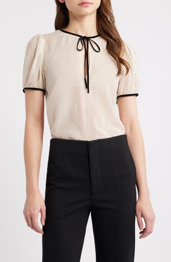 Polka Dot Tie Front Puff Sleeve Semisheer Silk Top