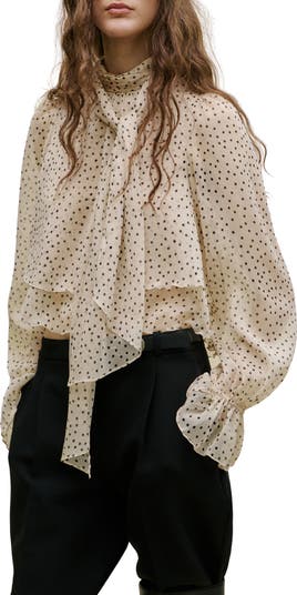 Flowy tiers and a flouncy tie at the neckline charm this blousy top covered in polka dots for a touch of retro style.
