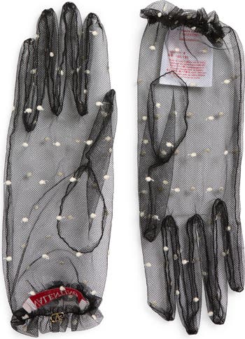 Signature VLOGO hardware shines at the gathered cuffs of these sheer tulle gloves punctuated with embroidered polka dots.