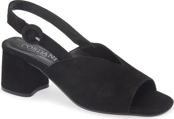 A notched instep and adjustable slingback strap add stylish dimension and a secure fit to a supple suede sandal grounded by a cushioned footbed and wrapped block heel.