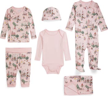 - Includes hat, bodysuit, zip footie, blanket, top and pants