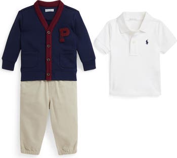 Options unfold in baby's wardrobe with this smart set that includes a staple polo, pants and a varsity-inspired cardigan.
