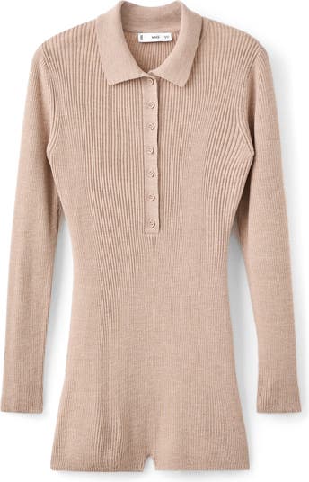 A polo-style collar brings a preppy twist to this long-sleeve romper in a curve-hugging and cozy-chic ribbed design.