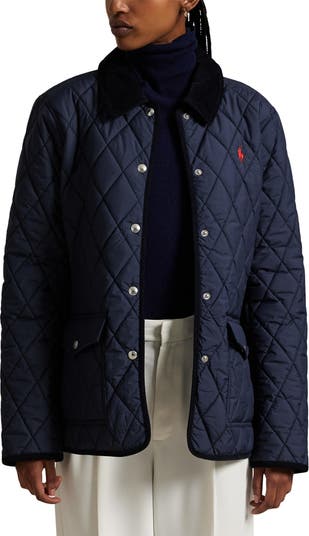 An embroidered polo rider galloping across the chest puts a house signature on this diamond-quilted barn jacket contrasted by a soft, wide-wale corduroy collar.