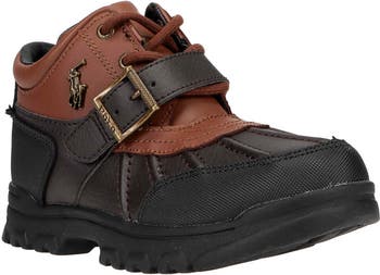 A pronounced lug sole ensures supreme traction while signature logos brand this kid-size duck boot that signals cold weather is near.