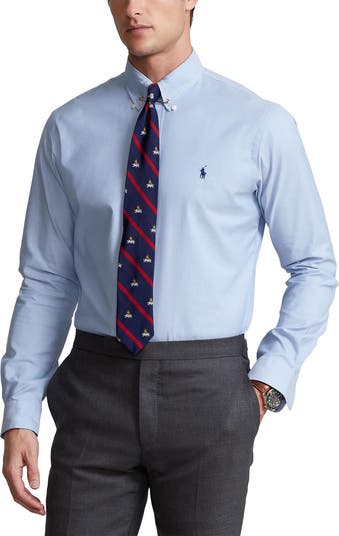 A solid hue brings versatility to a handsome button-down sport shirt tailored from crisp pinpoint cotton with a touch of added stretch.