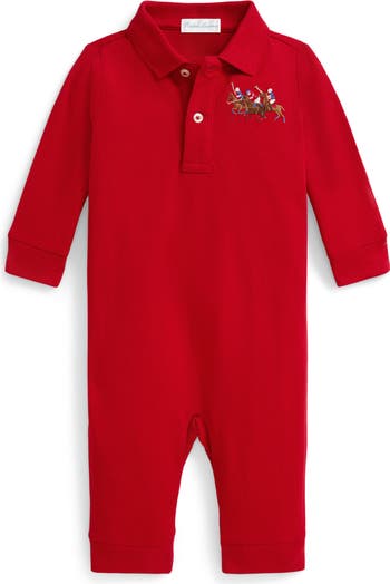 A trio of polo ponies and a captain's '3' patch adorably authenticate a bright red romper made from pure cotton.