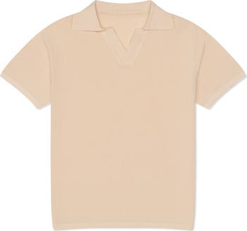 A jaunty collar adds sporty polish to a short-sleeve sweater rendered in a neutral hue.