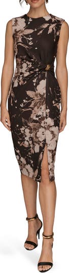 A gathered-and-twisted waistline shapes the silhouette of this flowery sleeveless midi framed by slight sleeves and accented with a leg-baring side slit.