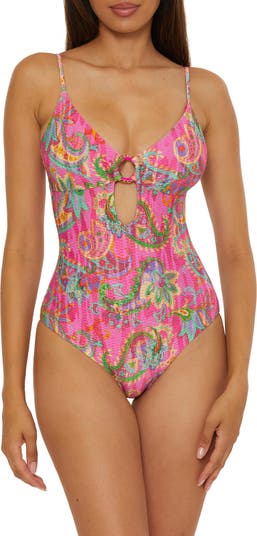 A chain-link ring gleams at the bust of this colorfully print one-piece with a splash of allover metallic shimmer.