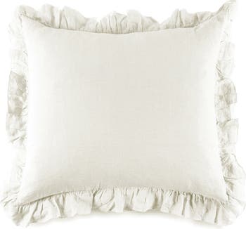 A lavish ruffled flange sweetens a pretty, clean-lined accent pillow woven in airy linen.