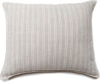 Muted stripes add to the understated elegance of a hand-loomed linen pillow finished with a softly frayed flange.