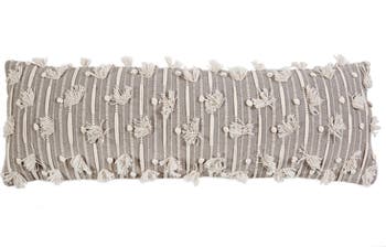 Knots, tassels and woven stripes lend tactile charm to a handwoven accent pillow plumped with plush feathers.