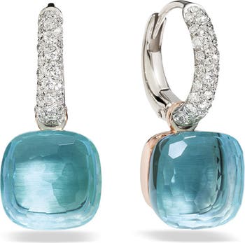 Sky-blue topaz stones set in rose-gold settings hang from sparkling diamond-pavé huggie hoops for a bit of icy glimmer at your lobes.
