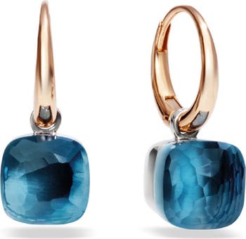 London-blue topaz stones hang from tapered rose-gold huggie hoops for a bit of icy glimmer at your lobes.