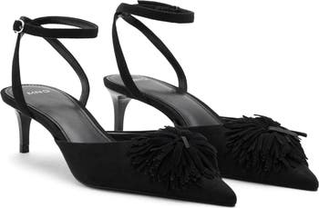 An oversized pompom appliqué adds rich texture to this kitten-heel pump sure to be a key piece of your statement-making look.
