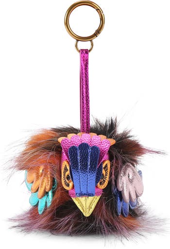 Add a whimsical flourish to your favorite bag with this fanciful bird charm made of silky faux fur and colorful metallic faux leather.