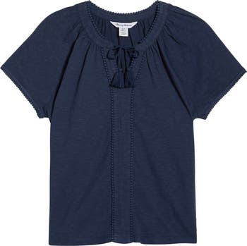 Pompom scallops trace the edges of this tassel-tied top cut from a supersoft organic-cotton blend.