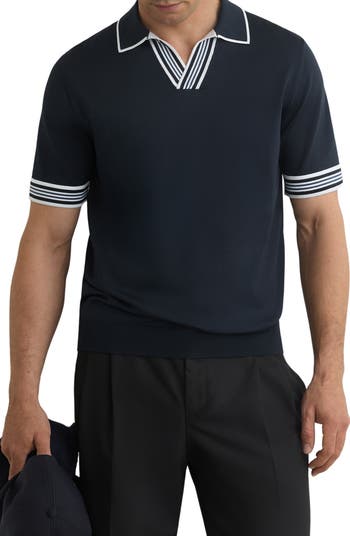 This short-sleeve polo leans into retro charm with bold striped trim and a cool johnny collar that frames the neckline just right. The fabric falls with a silky-soft, fluid drape to give the whole look a clean, confident swing.