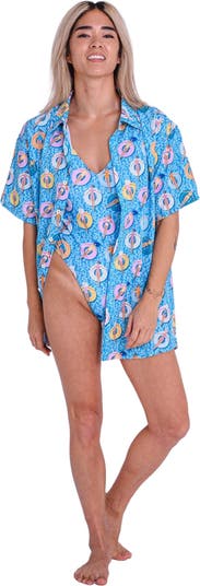 Chilled pool vibes all over these short sleeve shirts! These eye-catching aqua blue with rubber ring print shirts are guaranteed to brighten up your summer! Our shirts are a relaxed fit with short sleeves, featuring some delicious prints that will turn heads at Beach clubs, yacht holidays, hot tub parties or just down your local pool. Made from 100% Recycled Polyester from plastic bottles recovered from the sea & comes with a matching shorts to complete the look!! We also have matching women's swimwear for those matchy matchy poolside moments! Features:
