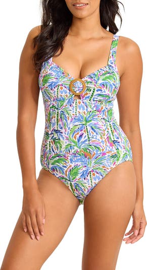 A colorful print brings playful energy to a getaway-worthy one-piece swimsuit featuring a woven ring detail at the bust.