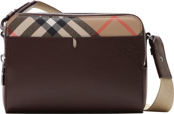 A compact crossbody bag made from calf leather with a pop of Burberry Check in signature sand beige. The style features an adjustable strap and is finished with an embossed Equestrian Knight Design.||Adjustable webbing strap|Two-way zip closure|Exterior slip pocket|Hand-painted edges|Brushed metal hardware|Comes with a dust bag