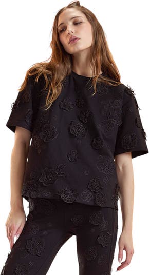 - Stretchy, comfy, and elevated with 3D floral appliqués.