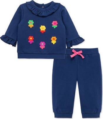 Baby can do it all in the comfort of this pure-cotton set made ultrastylish with vibrantly stitched blooms and ruffled trim.