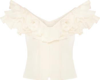 A little romance, a little drama, just the way we like it. This sculpted cotton top features cascading ruffles that frame the shoulders and neckline, a fitted bodice that flatters every curve, and a subtle front closure for an easy, polished finish.