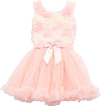 Rosette soutache creates a dimensional pattern on the bodice of a sleeveless dress that is finished with a fluffy petticoat skirt.