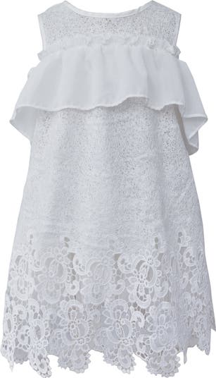 Guipure lace at the hem and a fluttery ruffle bring frothy dimension to a dreamy sleeveless shift dress perfect for the little lady with the flowers.