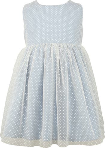A filmy tulle overlay lends a dreamlike misty look to the Swiss dot cotton of this charming sleeveless dress with a full, floaty skirt.
