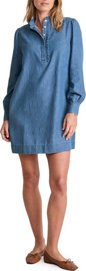 Frilly ruffles trim the collar and placket of a casual-cool shift cut from lightweight chambray with subtle blouson sleeves.