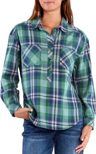 Buttery-soft lyocell patterned in rustic plaid defines a relaxed button-front shirt perfect for layering over and under other pieces all year 'round.