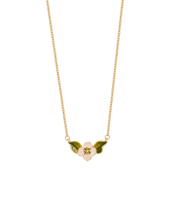 Hanging from the vintage-style gold chain is the beautiful Anemone flower. Hand-painted white petals nestled between green leaves it exudes charm and elegance and captures the quiet beauty of nature beneath the stars. Wear it to show your affinity to the fantastical forest adventures you dream of.