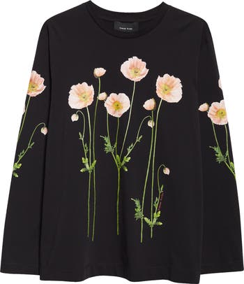 Papery-petaled field poppies grace this long-sleeve cotton T-shirt that features print on a high-contrast black ground for delicate drama.