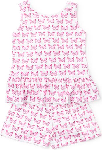 Girls' pima sleeveless open back ruffle swing top. Shorts have an elastic waistband. Made from 100% Peruvian Pima Cotton.