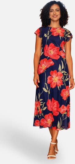 This vibrant midi dress showcases a striking poppy print that brings bold colour and effortless elegance to your look. Its relaxed silhouette and soft drape make it perfect for warm days, special occasions, or any moment that calls for easy sophistication. With its cap sleeves and flowing shape, it offers both comfort and standout style.