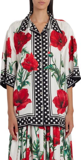 Poppies and polka dots bring graphic punch to a silk-twill shirt designed with a dramatically elongated collar and elbow-length sleeves.
